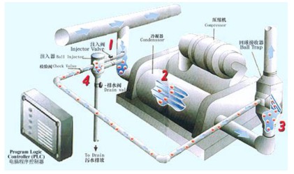 1、電腦程序控制器啟動(dòng)清洗循環(huán),將注射閥門打開,控制特殊球進(jìn)入冷凝器循環(huán)系統(tǒng); 2、尺寸比管道稍大的軟質(zhì)材料制成的特殊球通過冷凝器,將冷凝器管壁上的水垢和污垢帶走; 3、特殊球通過冷凝器后,被回收器接收; 4、電腦程序控制器打開排水閥門,球自動(dòng)回到球注入槽,槽中的水自動(dòng)將特殊球進(jìn)行清洗、排污、排水閥門關(guān)閉,完成一次循環(huán)。遵此電腦程序每天進(jìn)行36次循環(huán)清洗。 |